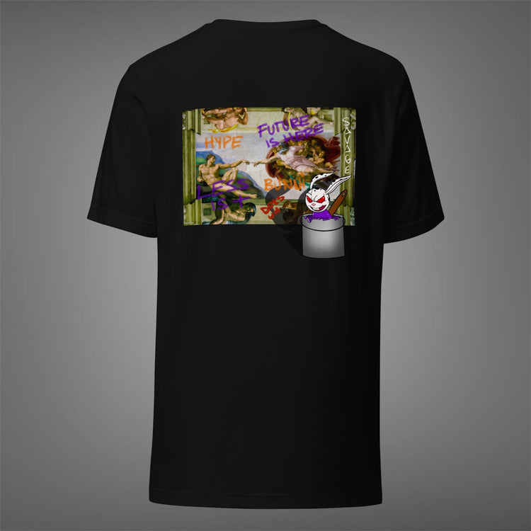 The Creation of Snow T-Shirt, a striking blend of classical art and urban culture. This exclusive design features "Snow", the beloved white bunny from HypeBunnies, adding a contemporary graffiti twist to a timeless masterpiece.